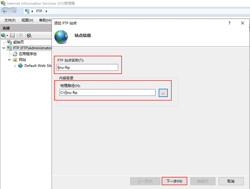 4)進入【添加FTP站點】界面,輸入FTP站點名稱和其目錄的物理路徑。物理路徑是需要共享的目錄的位置。點擊【下一步】。