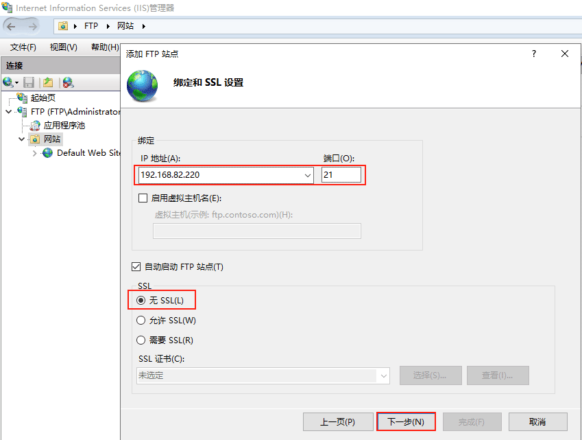 端口選擇默認21號端口。在這里選擇【無SSL】。