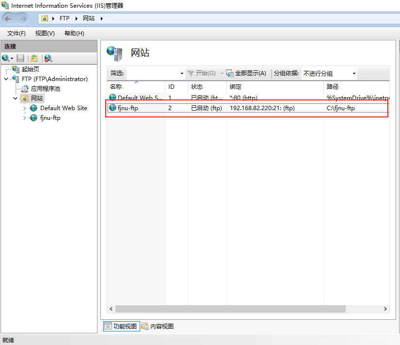 7)返回【網站】界面,在列表中新的FTP站點fjnu-ftp已經創建完成,并成功啟動。