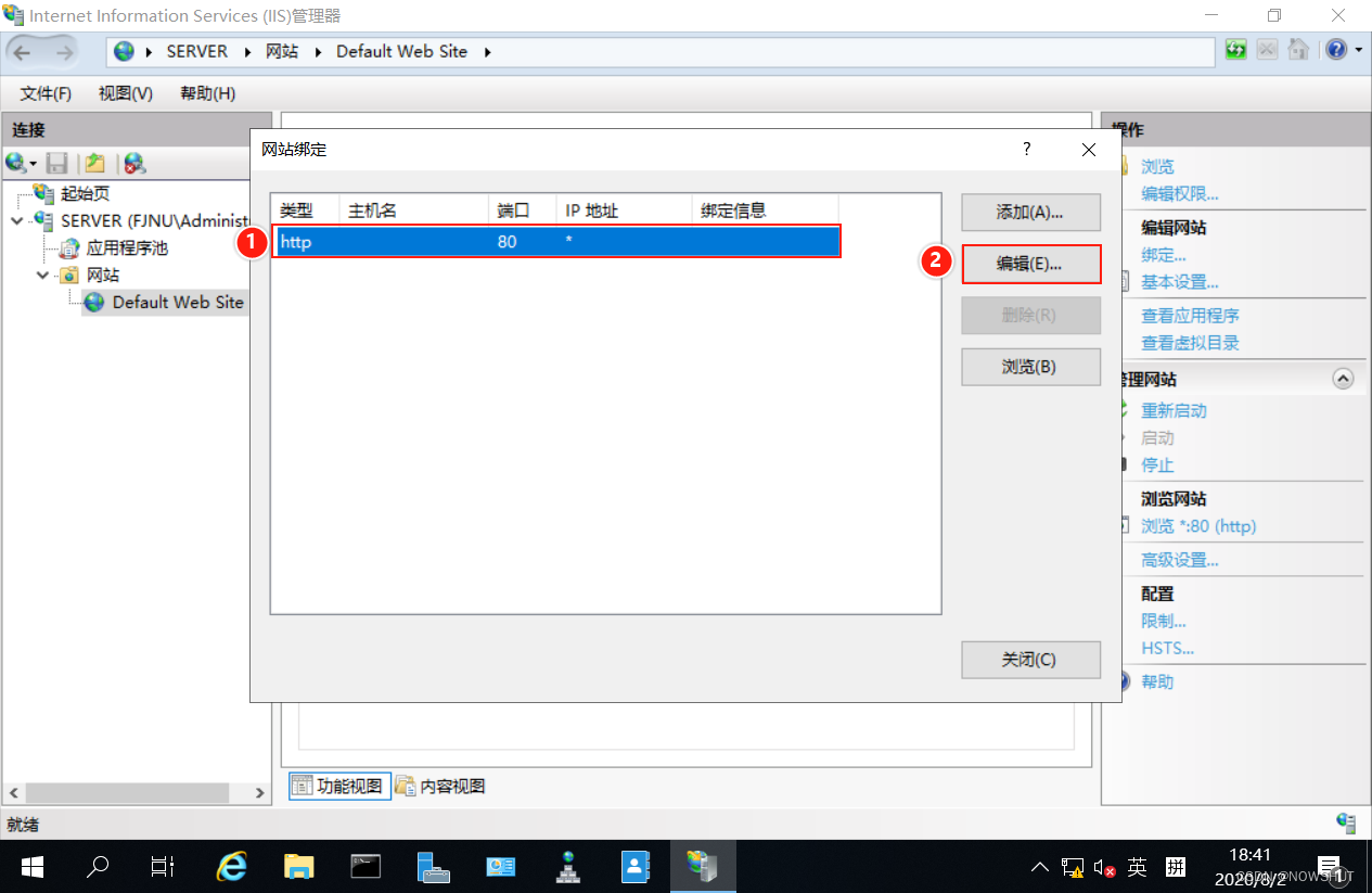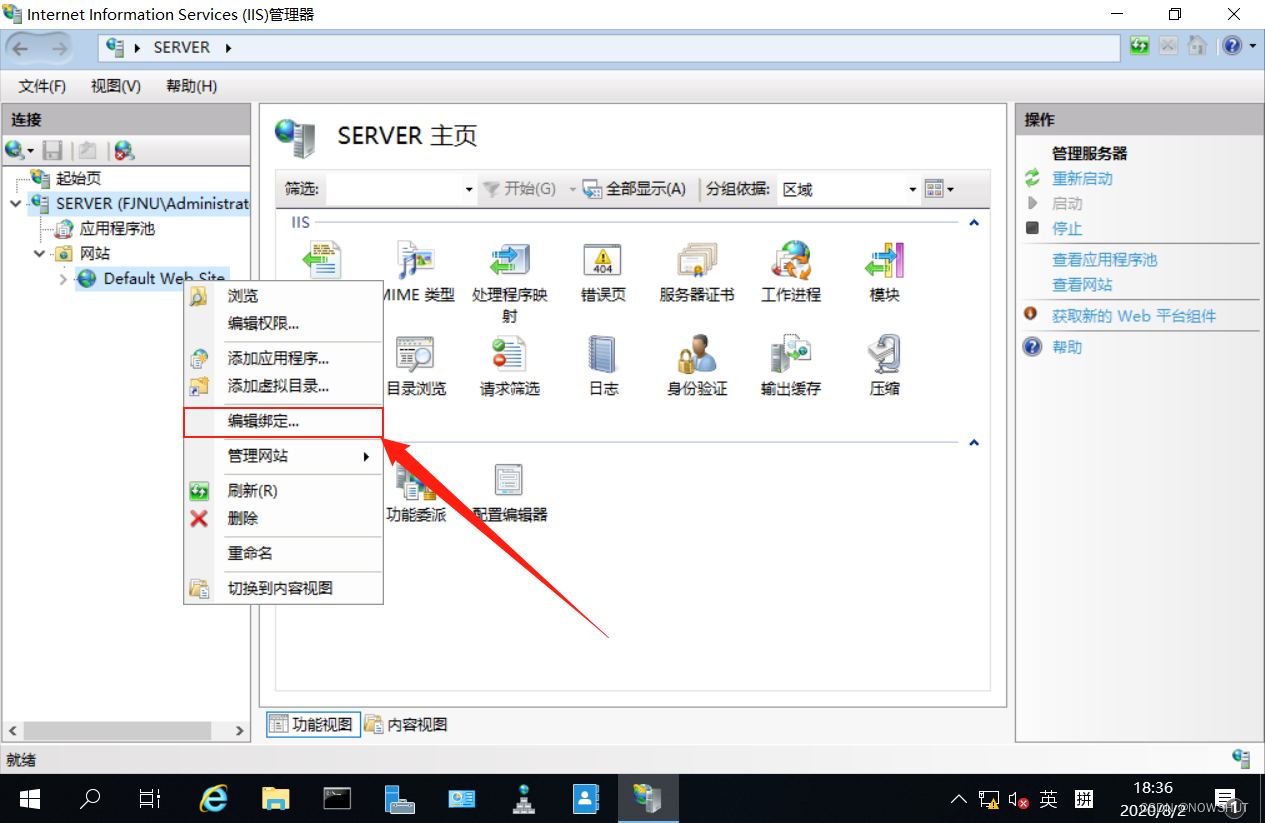 (2)在左邊連接欄中,展開左側的內(nèi)容,找到【Default Web Site】,右鍵選擇【編輯綁定…】。