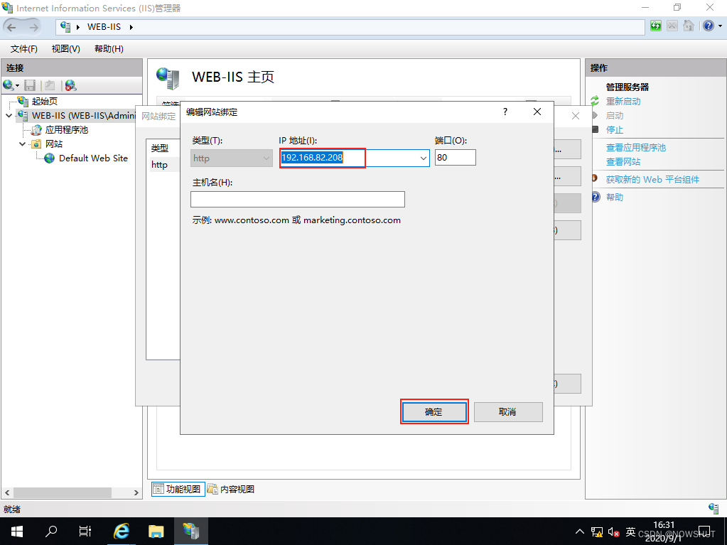 (5)打開【編輯網(wǎng)站綁定】,將IP地址指定為192.168.82.208,點擊【確定】。