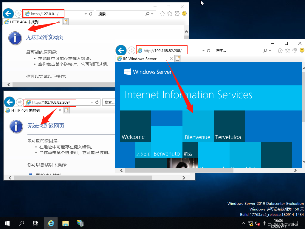 (7)驗證網(wǎng)站IP地址唯一性。打開IE瀏覽器,輸入http://192.168.82.209發(fā)現(xiàn)無法打開網(wǎng)頁,輸入其他地址也是如此。但是輸入http://192.168.82.208可以正常打開網(wǎng)站。