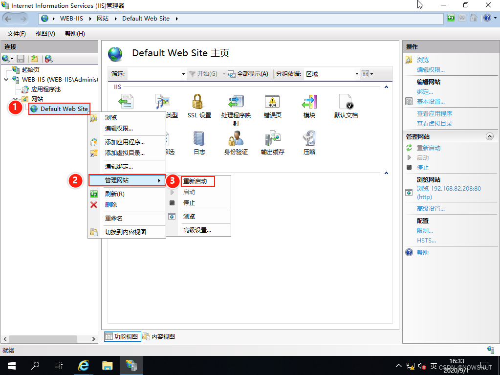 (6)重新啟動網(wǎng)站,對【Default Web Site】點擊鼠標右鍵,選擇【管理網(wǎng)站】,然后選擇【重新啟動】