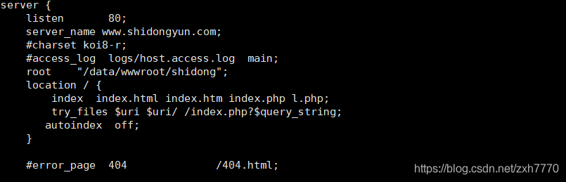 server { listen 80; server_name shidongyun.com; #charset koi8-r; #access_log logs/host.access.log main; root '/data/wwwroot/shidong'; location / {index index.html index.htm index.php l.php;rewrite ^/(.*) http://www.shidongyun.com/$1 permanent;try_files $uri $uri/ /index.php?$query_string; autoindex off; } 省略多余的部分.....只需要看rewrite跟service_name即可}server { listen 80; server_name www.shidongyun.com; #charset koi8-r; #access_log logs/host.access.log main; root '/data/wwwroot/shidong'; location / {index index.html index.htm index.php l.php;try_files $uri $uri/ /index.php?$query_string; autoindex off; }省略多余的部分.....只需要看service_name即可。root設置項目路徑。 }重啟nginx服務器1, /etc/init.d/nginx restart