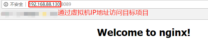 server { listen 8089; #修改為虛擬機的IP地址 server_name 192.168.88.130; location / {root html;index index.html index.htm; }}通過IP地址訪問目標項目測試如下: