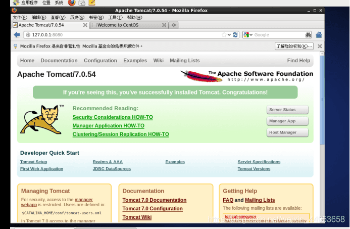 [root@localhost ~]# tar xvf apache-tomcat-7.0.54.tar.gz [root@localhost ~]# mv apache-tomcat-7.0.54 /usr/local/tomcat [root@localhost ~]# /usr/local/tomcat/bin/startup.sh //啟動Tomcat程序3.搭建成功實例