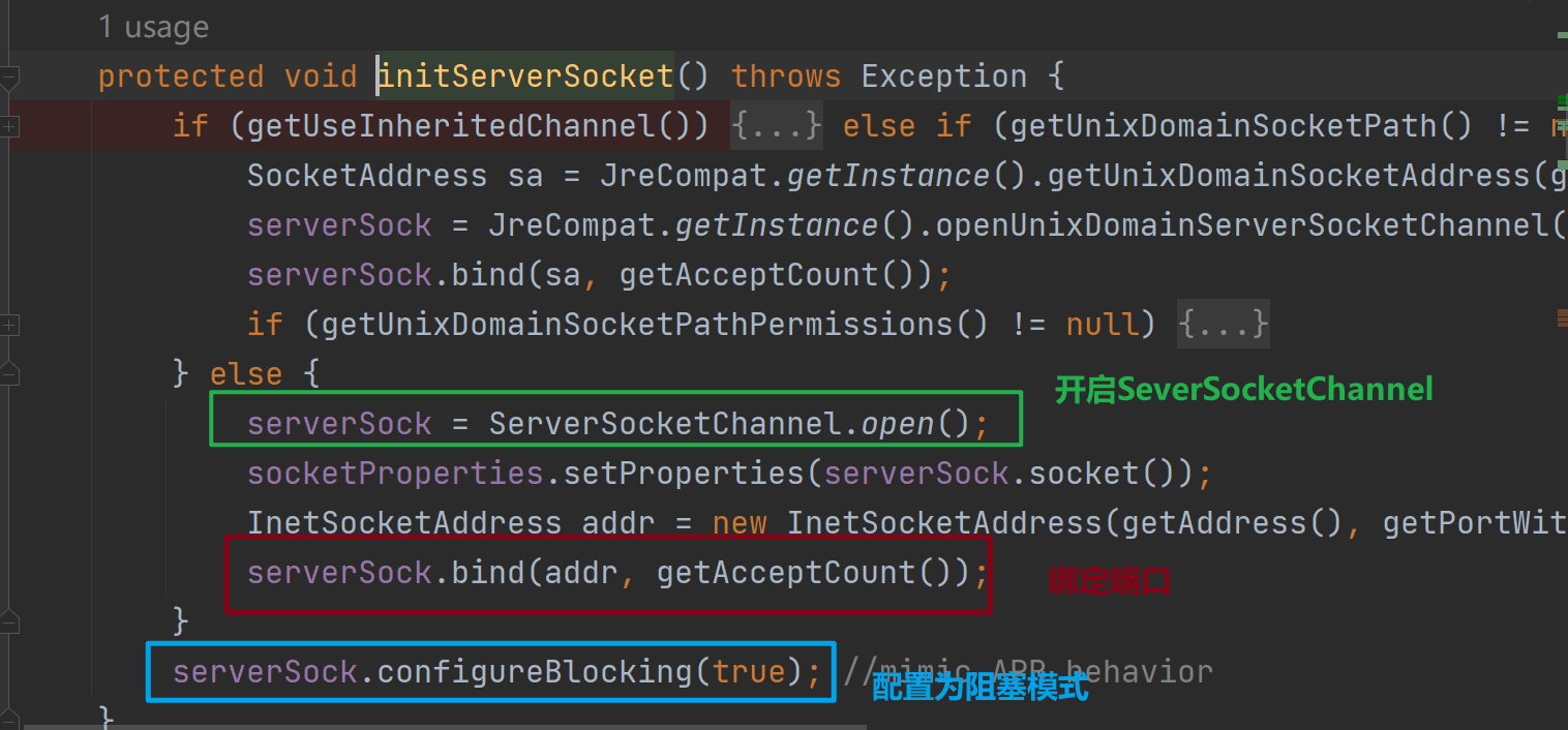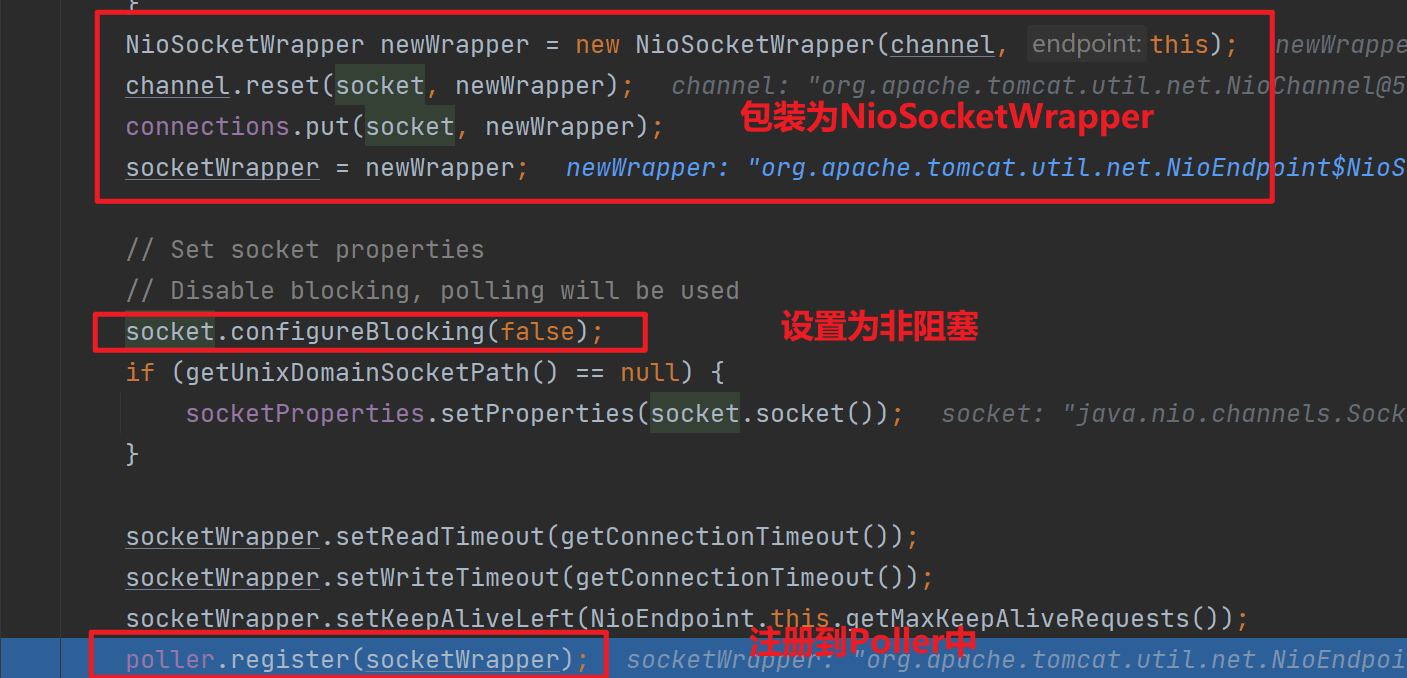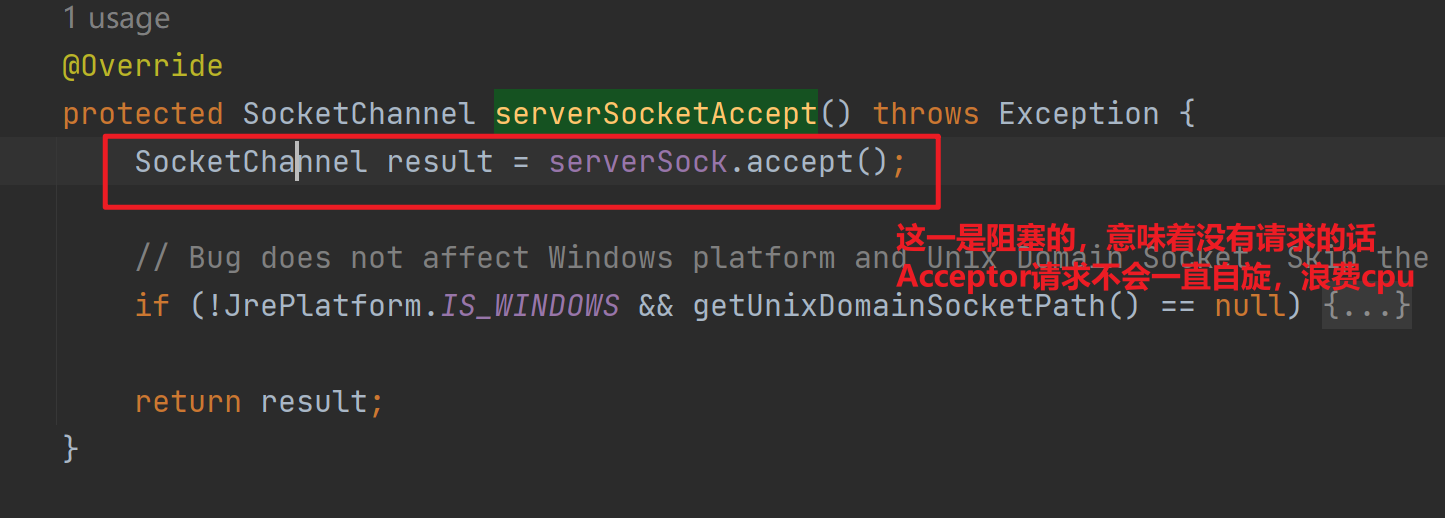 由于NioEndpoint前面調(diào)用了ServerSocketChannel#configureBlocking(true),所以serverSock#accept,在沒(méi)有連接上來(lái)時(shí),不會(huì)立馬返回null,而是阻塞直到連接來(lái)到。