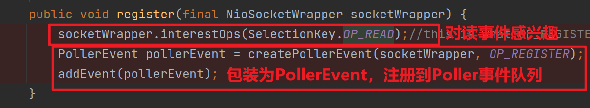 在Acceptor線程接收到SocketChannel后,會(huì)調(diào)用Poller#register方法進(jìn)行注冊(cè),Acceptor只負(fù)責(zé)接受請(qǐng)求,請(qǐng)求后續(xù)的處理由Poller線程負(fù)責(zé)