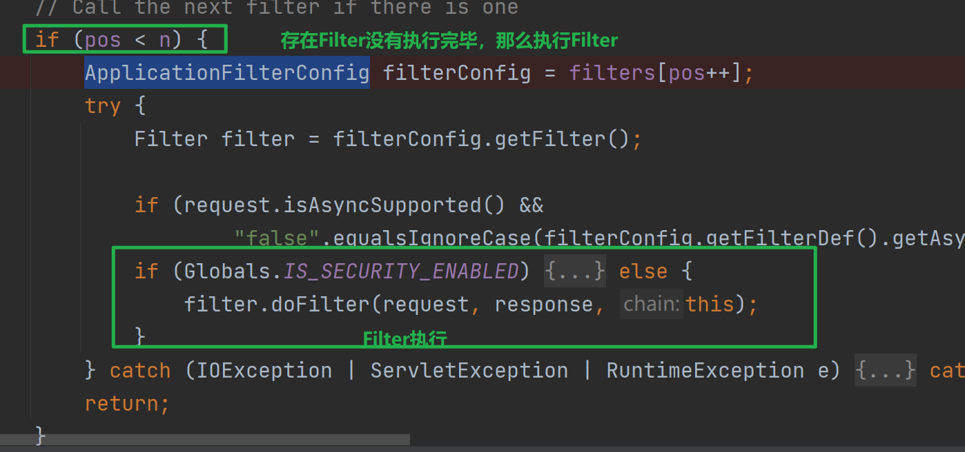 ApplicationFilterChain包含多個(gè)ApplicationFilterConfig,使用數(shù)組和pos屬性記錄當(dāng)前執(zhí)行到第幾個(gè)Filter