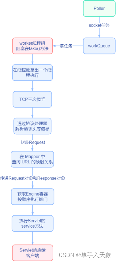 他是創(chuàng)建一組線程的,每個(gè)線程任務(wù)都是一個(gè)阻塞隊(duì)列,用于對(duì)請(qǐng)求進(jìn)行處理(例如我們中間件參數(shù)中的最大線程數(shù)就是指最多創(chuàng)建多少個(gè)Worker線程)。每個(gè)Worker線程任務(wù)包括分析解析請(qǐng)求報(bào)文、創(chuàng)建 Request 對(duì)象、調(diào)用容器的 管道pipeline 執(zhí)行閥門(mén)value、執(zhí)行servlet的具體邏輯。