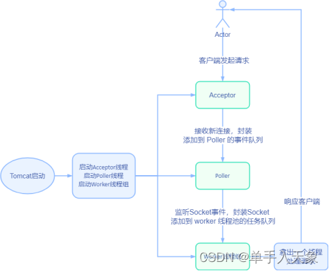 然后Tomcat會(huì)創(chuàng)建Worker 線程池、Acceptor線程、Poller線程: