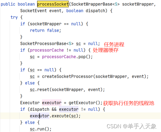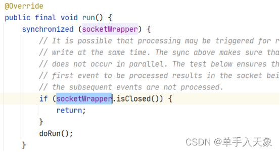 當(dāng)新任務(wù)添加到 workQueue后,workQueue.take() 阻塞就會(huì)結(jié)束,會(huì)返回一個(gè) Runnable,通常是 SocketWrapperBase,然后 worker 線程調(diào)用 SocketWrapperBase的 run() 方法對(duì) Socket 進(jìn)行處理。