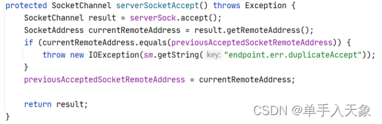 點(diǎn)進(jìn)去NioEndpoint.serverSocketAccept(因?yàn)槭褂肗IO模式),可以看到我們熟悉的nio的accept方法,這是一個(gè)阻塞的方法,會(huì)一直等待接收請(qǐng)求。