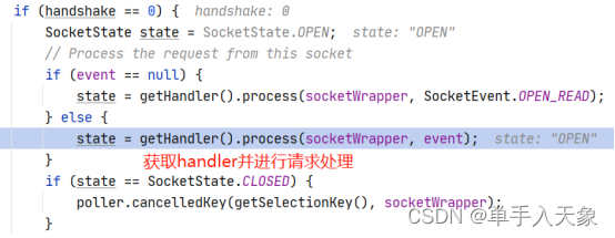 第二次執(zhí)行時(shí)event對(duì)象是OPEN_READ,如果停用長(zhǎng)連接,執(zhí)行完返回的是CLOSE,關(guān)閉連接,否則不關(guān)閉走到下面,他是獲取協(xié)議處理器,并執(zhí)行他的process方法