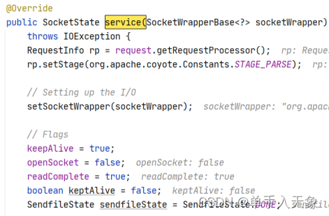 跟進(jìn)去AbstractProcessorLight.process,然后到了Http11Processor.service,service方法先是從當(dāng)前請(qǐng)求request中,解析請(qǐng)求行、請(qǐng)求頭、請(qǐng)求體,封裝成Request對(duì)象