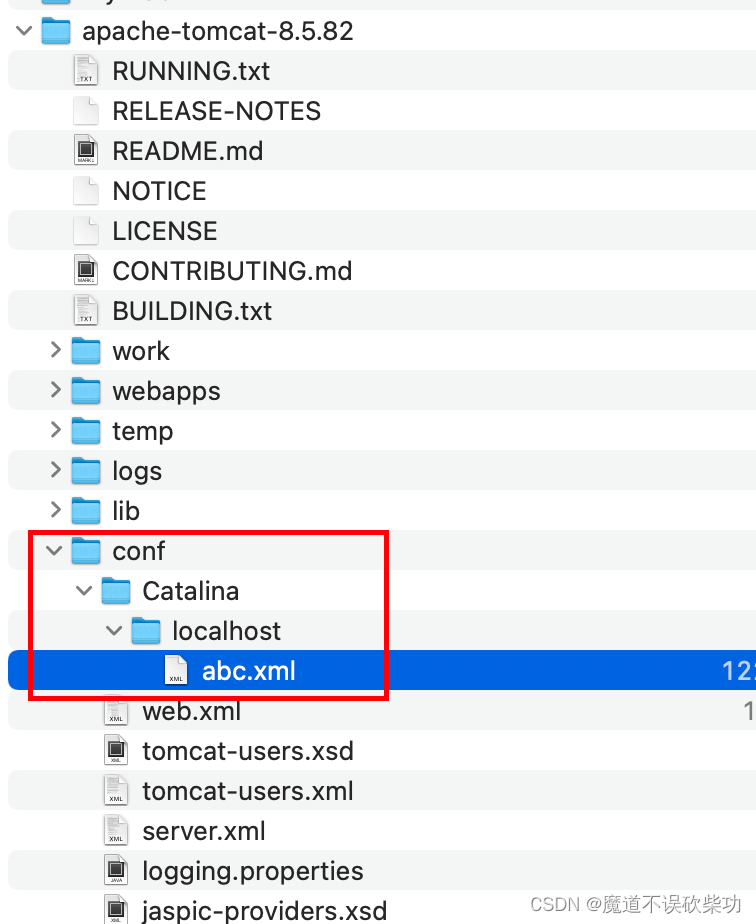 當你運行一次 Tomcat 之后,Tomcat 會自動在 conf 文件目錄下自動生成 /config/Catalina/localhost/ 目錄。然后你就可以在這個目錄下新建一個 xml 文件。xml 文件名稱就是你網站的訪問路徑。比如新建一個 abc.xml 文件,如下所示: