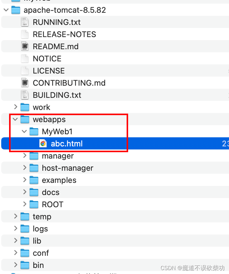 <Server port='8005' shutdown='SHUTDOWN'> <Service name='Catalina'> <Connector port='8080' protocol='HTTP/1.1' connectionTimeout='20000' redirectPort='8443' /> <Engine name='Catalina' defaultHost='localhost'> <Context path='/myWeb1' docBase='/Users/gwm/Downloads/MyWeb1' reloadable='true'> </Engine></Service></Server>appBase:相當于是一個主機的根目錄 /,默認名稱叫做 webappspath:在 webapps 主機下會有多個網站,可以通過 path 來進行區分docBase:path 訪問網站文件具體目錄,比如上面的 abc.html 就在 /Users/gwm/Downloads/MyWeb1 文件目錄下。因為 docBase 可以指定網站資源文件位置,所以你就不用將網站再放到之前的 webapps 主機下面。所以最終訪問 abc.html 的路徑是:http://localhost:8080/myWeb1/abc.html。