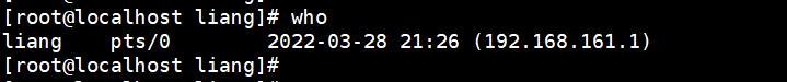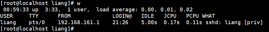 User: 登錄用戶名TTY: 登錄后系統(tǒng)分配的終端號From: 遠程主機名,即從哪登錄的 loqin@:何時登錄IDLE: 用戶空閑時間。這是個計時器,一日用戶執(zhí)行任何操作,改計時器就會被重置。JCPU: 和終端連接的所有進程占用時間,包括當前正在運行的后臺作業(yè)占用時間PCPU: 當前進程所占用時間WHAT: 當前正在運行進程的命令行pts: 說明是用遠程工具連接的,比如:xshell,后面的數(shù)字代表登錄的時間順序,越小證明登錄的越早5.2.2 who