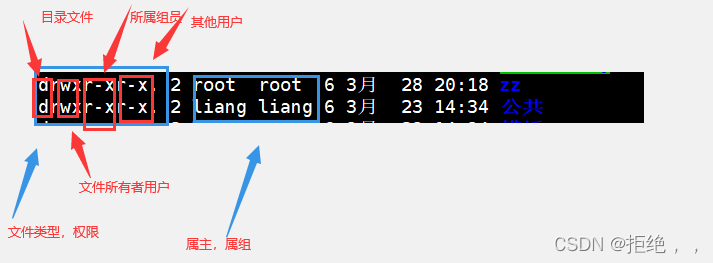 擁有該文件或目錄的用戶帳號屬組:擁有該文件或目錄的組帳號2.0 查看文件/目錄的權限和歸屬示例: