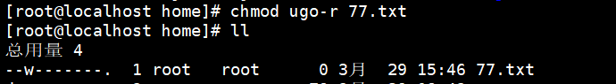 3.1.1.將文件77.txt去除所有人不可讀所有者可寫權限:chmod ugo-r 77.txt