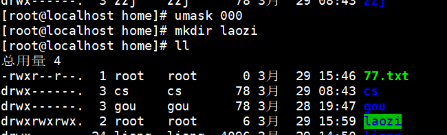 新建目錄laozi權限為所有人可讀可寫可執(zhí)行umask 000mkdir laozi
