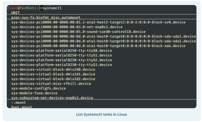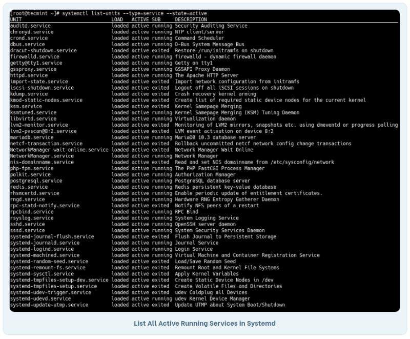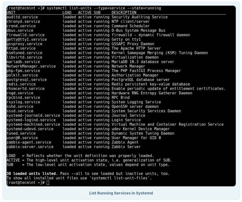 在 Linux 中列出 SystemD 下正在運行的服務當您運行不帶任何參數的 systemctl 命令時,它將顯示所有加載的 systemd 單元的列表(閱讀 systemd 文檔以獲取有關 systemd 單元的更多信息),包括服務,顯示它們的狀態(無論是否處于活動狀態)。