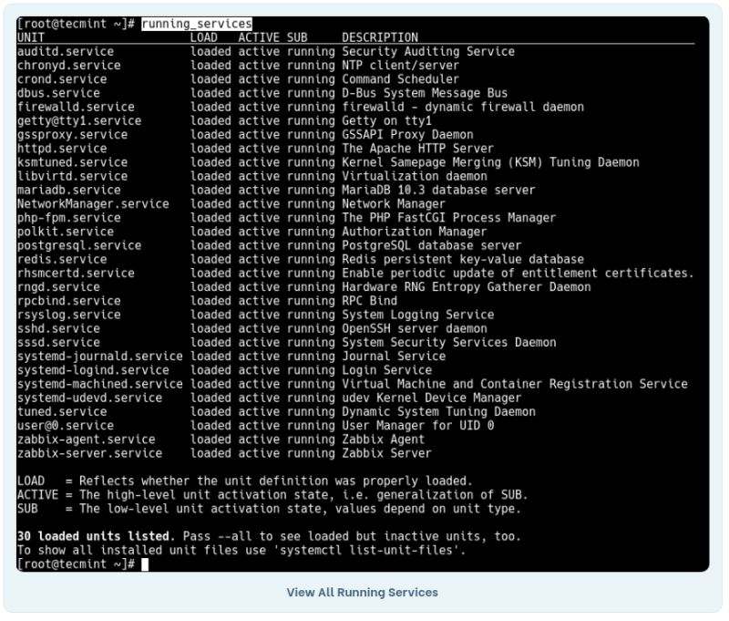 保存文件中的更改并關閉它。從現在開始,使用“running_services”命令查看服務器上所有已加載、正在運行的服務的列表。
