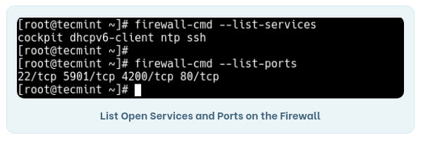 # firewall-cmd --list-services [FirewallD]# firewall-cmd --list-ports$ sudo ufw status [UFW Firewall]