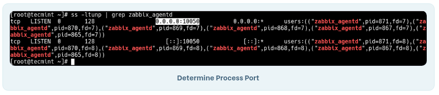 # netstat -ltup | grep zabbix_agentdOR# ss -ltup | grep zabbix_agentd第五列顯示套接字:Local Address:Port。在這種情況下,進程 zabbix_agentd 正在偵聽端口 10050。