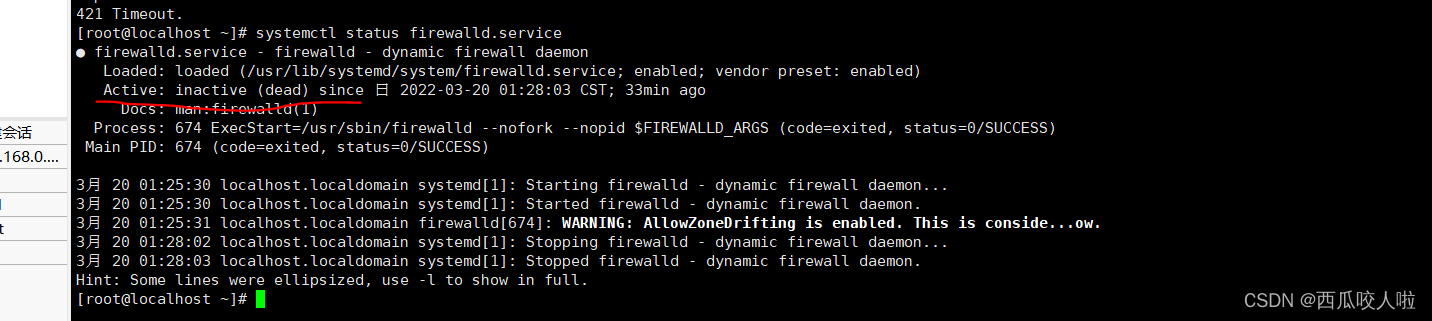 #查看防火墻狀態 systemctl status firewalld.service#關閉防火墻systemctl stop firewalld.service關閉防火墻成功: