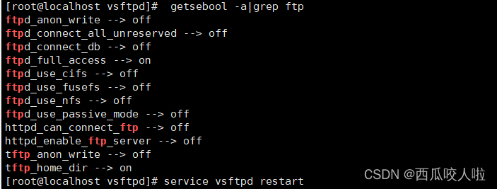 #運行以下命令修改:setsebool -P allow_ftpd_full_access onsetsebool -P ftpd_home_dir on#重啟vsftpdservice vsftpd restart