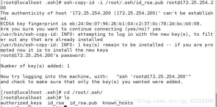 ssh-copy-id? -i? /root/.ssh/id_rsa.pub? root@172.25.254.200???? 加密sshd 服務 給服務主機加密就是上鎖會生成:authorized_keys 此文件出現表示加密完成
