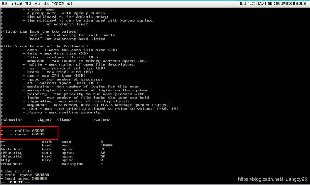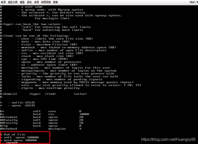 vi /etc/security/limits.conf將前兩行帶*號的兩條數量變更為自己所需要的即可,部分修改完不會立即生效,可重啟測試。