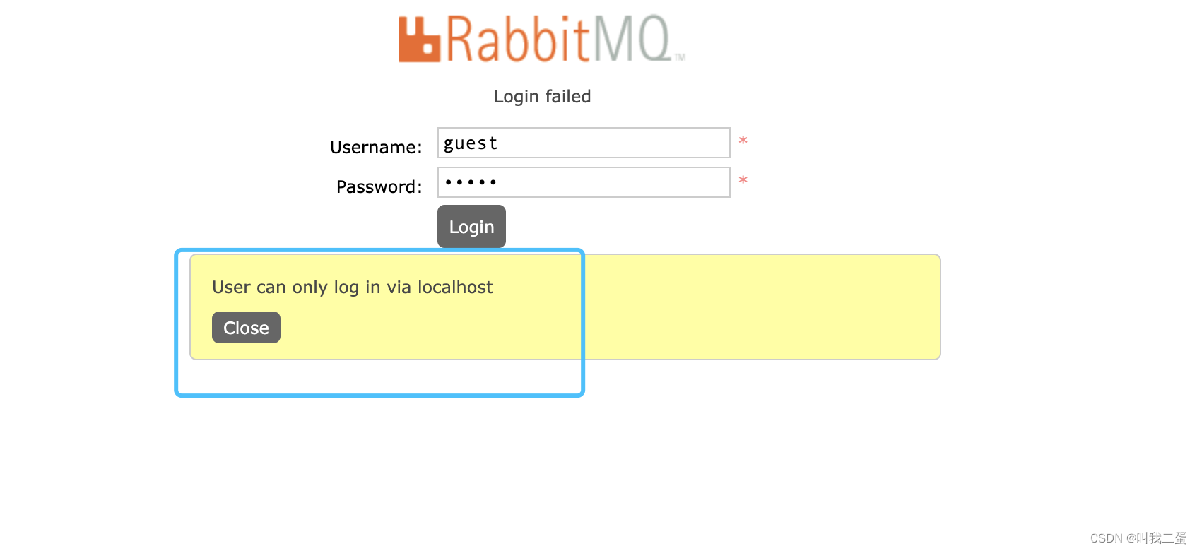 guest帳號只能在RabbitMQ安裝服務器上登錄,如下圖提示信息