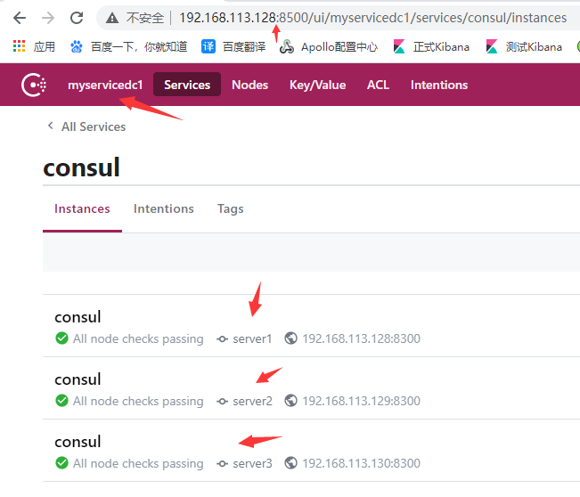 192.168.113.128:./consul agent -server -bootstrap-expect=3 -data-dir=/root/consul_1.8.5_linux_amd64 -node=server1 -bind=192.168.113.128 -client=0.0.0.0 -datacenter=myservicedc1 -ui192.168.113.129:./consul agent -server -bootstrap-expect=3 -data-dir=/root/consul_1.8.5_linux_amd64 -node=server2 -bind=192.168.113.129 -client=0.0.0.0 -datacenter myservicedc1192.168.113.130:./consul agent -server -bootstrap-expect=3 -data-dir=/root/consul_1.8.5_linux_amd64 -node=server3 -bind=192.168.113.130 -client=0.0.0.0 -datacenter myservicedc1