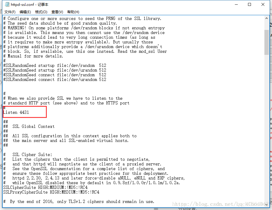 點(diǎn)擊Apache (httpd-ssl.conf)打開配置文件后,直接使用搜索功能找到443端口的配置,將端口修改為4431(之前步驟二中修改的);