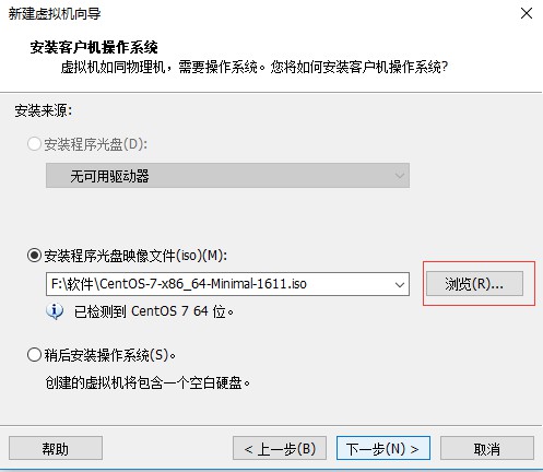 四、在安裝客戶機操作系統界面,選擇安裝程序光盤鏡像文件(這里選擇用iso文件進行安裝)選項,該選項右側的“瀏覽”按鈕可以選擇iso文件的存放路徑,返回點擊“下一步”: