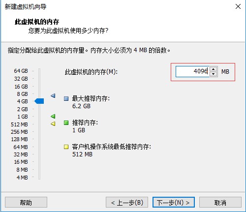 七、進入虛擬機內存配置界面,這里選擇給虛擬機分配4G的內存(默認配置是1G內存),然后點擊“下一步”:
