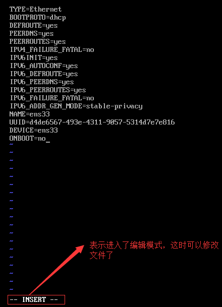 修改ONBOOT的值。按住鍵盤的方向鍵可以上下左右跳到光標的順序。將光標移動到ONBOOT,并按一次鍵盤上面的“i”,表示進入編輯模式: