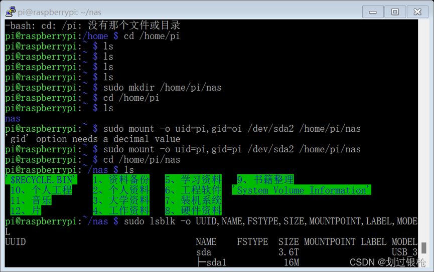 sudo mkdir /home/pi/nassudo mount -o uid=pi,gid=pi /dev/sda2 /home/pi/nas