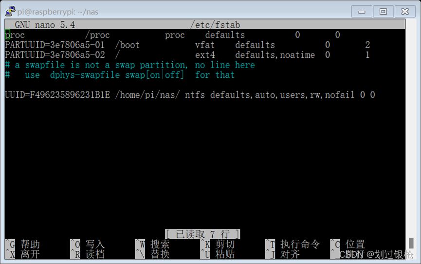 sudo nano /etc/fstab在文檔的末尾,添加硬盤UUID和掛載目錄:UUID=xxxxxxxx-xxxx-xxxx-xxxx-xxxxxxxxxxxx /home/pi/nas/ ntfs defaults,auto,users,rw,nofail 0 0