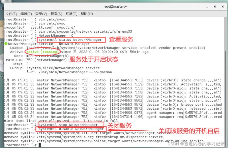 systemctl disable NetworkManager:關(guān)閉該服務(wù)的開(kāi)機(jī)自啟功能