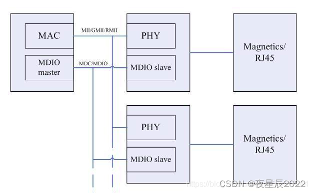 內部的 MAC 外設會通過 MII 或者 RMII 接口來連接外部的 PHY 芯片, MII/RMII 接口用來傳輸網絡數據。另外主控需要配置或讀取 PHY 芯片,也就是讀寫 PHY 的內部寄存器,所以還需要一個控制接口,叫做 MIDO, MDIO 很類似 IIC,也是兩根線,一根數據線叫做 MDIO,一根時鐘線叫做 MDC。
