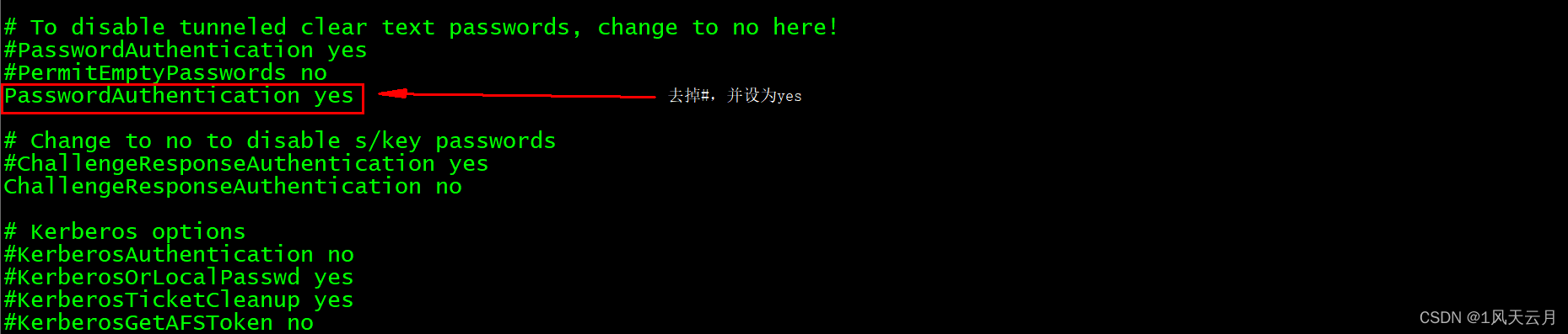 去掉PasswordAuthentication前邊的#號,將后面修改為yes