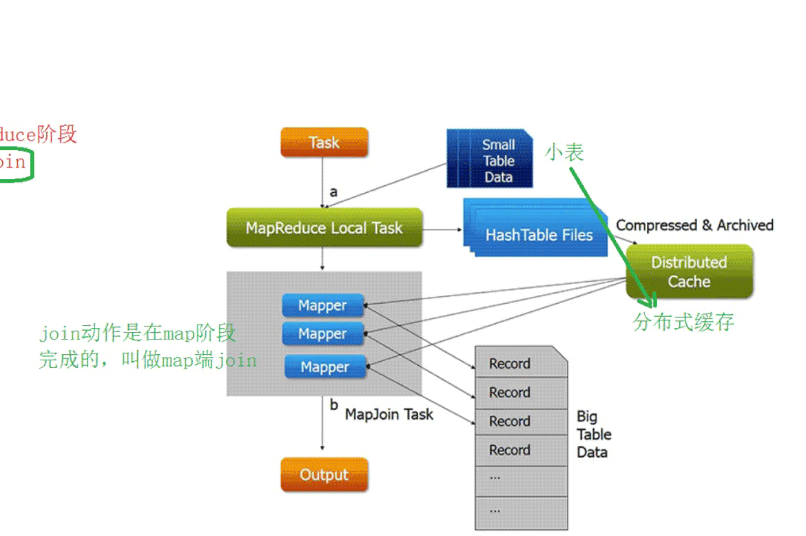 - 啟動mr程序(只有map階段)并行處理大數(shù)據(jù),并且從自己的緩存中讀取小表數(shù)據(jù),進行join,結(jié)果直接輸出到文件中