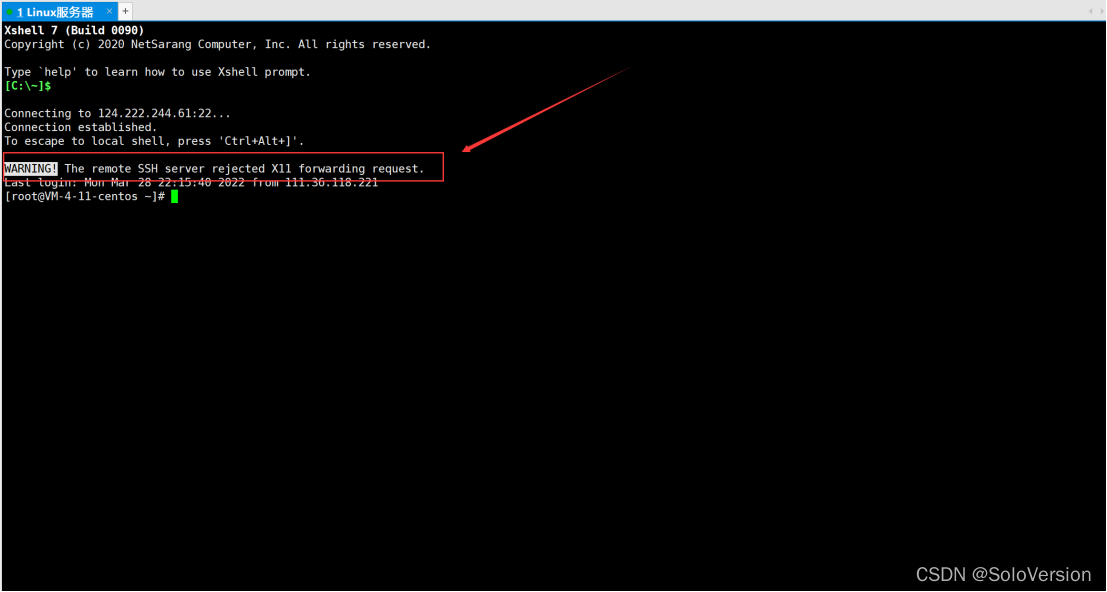 - 7. 上圖出現(xiàn)了一個警告“The remote SSH server rejected X11 forwarding request.”意思是“遠程SSH服務(wù)器拒絕X11轉(zhuǎn)發(fā)請求。”
