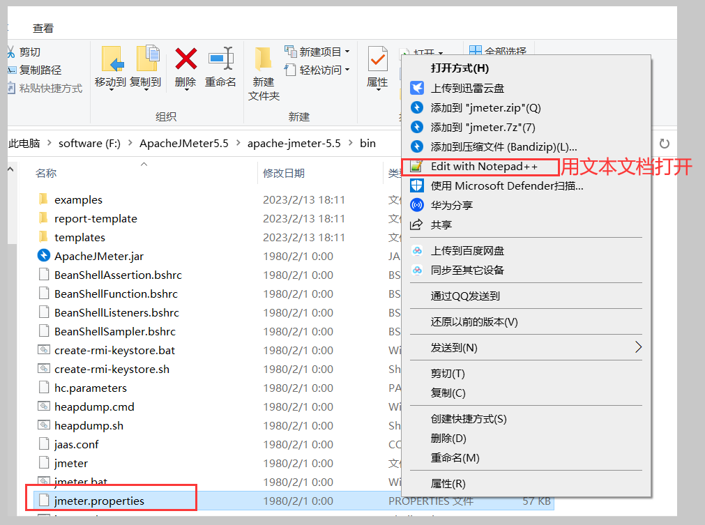 在安裝目錄的bin目錄中找到 jmeter.properties,右鍵使用文本編輯器打開,這里我用的notepad++