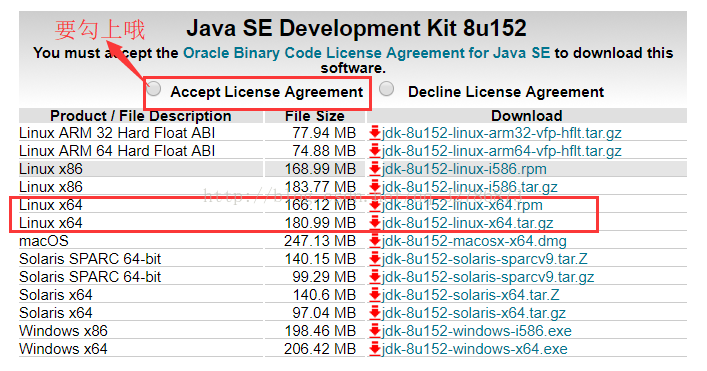 下載jdk-8u152-linux-x64.rpm 或 jdk-8u152-linux-x64.tar.gz(根據自己的系統位數選擇對應的包)