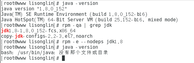卸載jdk:rpm -e --nodeps jdk1.8 (此處也可以使用全名jdk1.8-1.8.0_152-fcs.x86_64)