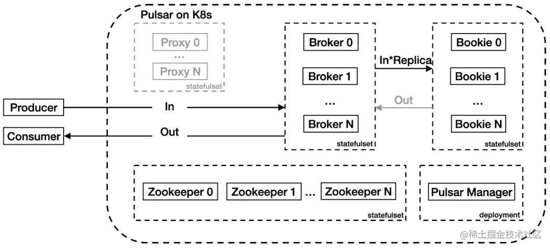 原生部署架構中,流量從 Proxy 代理層進入,經過 Broker 邏輯服務層寫入 Bookie 存儲層。Proxy 代理層代理客戶端和 Broker 之間的連接,Broker 層管理 Topic,Bookie 層負責持久化消息存儲。在上圖中,入流量和出流量分別用 In 和 Out 進行標記,Replica 是配置的副本。
